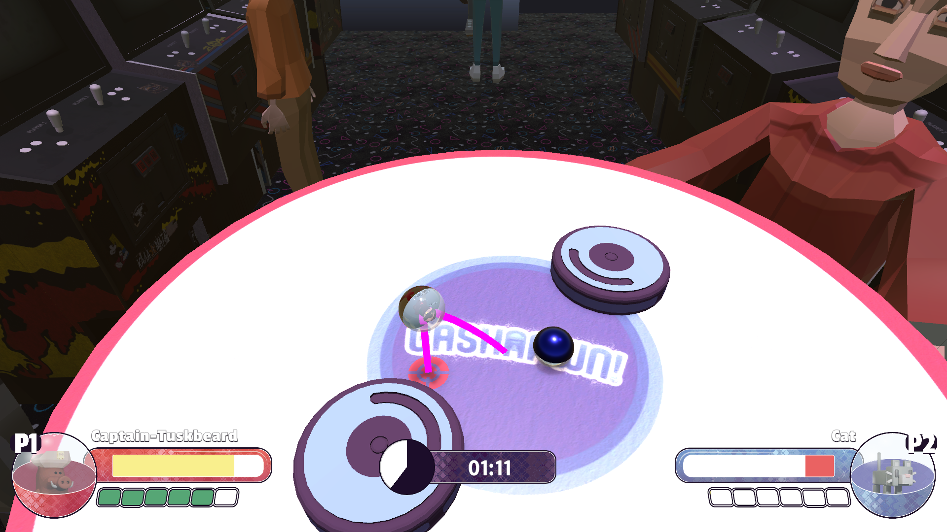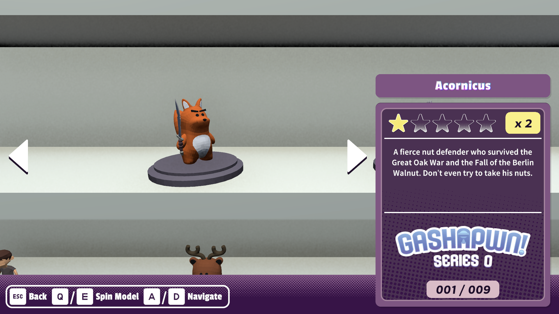 Jump, slam, and charge into your opponents in this 1-v-1 gashapon capsule battle game! Use your momentum to slam into your opponent and manage your stamina to execute flashy special moves. You and your opponent are selected from a roster of figures, each with different rarities. The winner is dispensed and added to your collection.